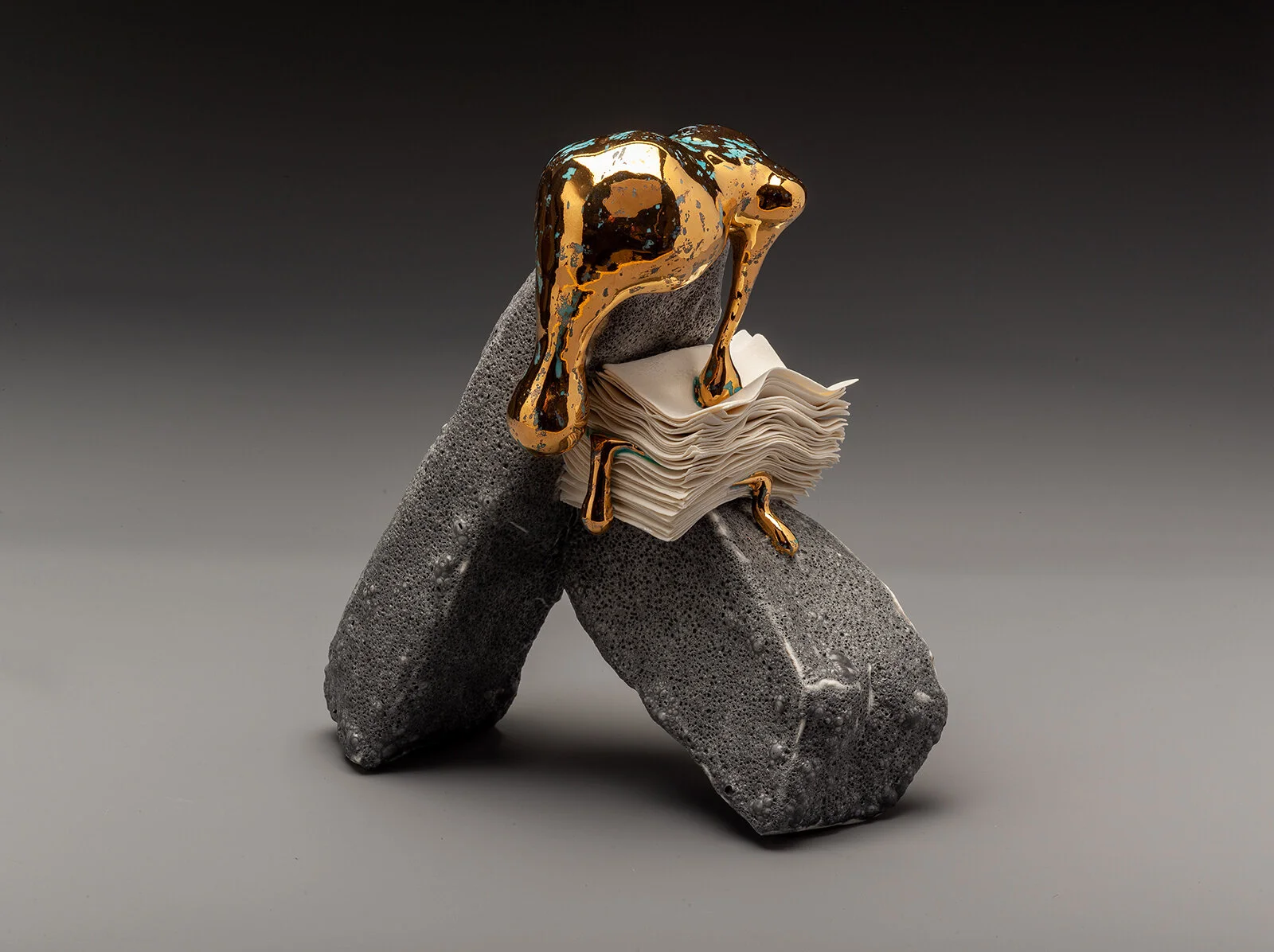 Rock-like forms covered in textured volcanic glaze support a stack of ruffled unglazed porcelain sheets. Amorphous drips of gold sit on top and from within the sheets oozing slowly.